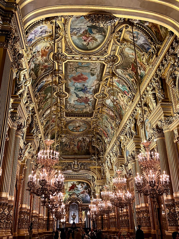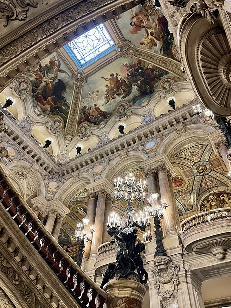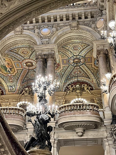 … which is, all by itself, worth a trip to the City of Light. My God. This opera house, named for its architect, Charles Garnier, was built in the Napoleon III style over a roughly 15-year period beginning in 1861, by order of Emperor Napoleon III. Its ornate interior makes you gasp when all you’re looking at is the stairwell.