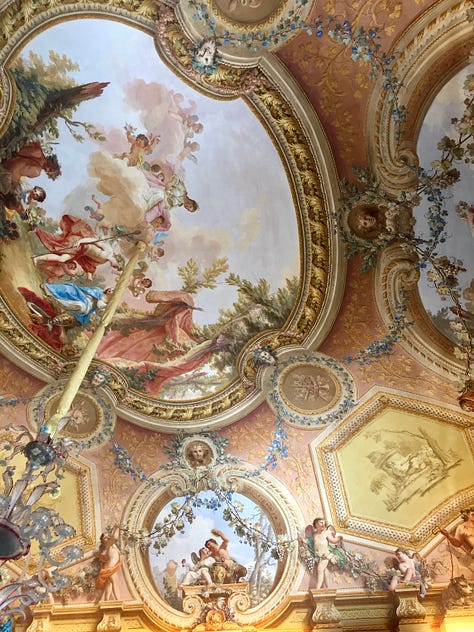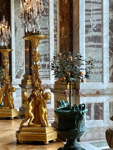 Memory is a persnickety beast, at times unreliable or kindly deceitful, at times indicative of the truth. When my son suggested we go to Versailles, I agreed, remembering little about it. (Proving, at least to me, how much photos bolster our memories; in those pre-smartphone days I took relatively few of them.) The palace itself has some beautiful rooms but overall comes across as dreary. Even the Hall of Mirrors, though lovely, didn’t knock my socks off. (What drew my eye most were some globe-shaped orange trees stationed at each window.) By the way, not to be all Italy-centric (which I am), there’s a “mini Hall of Mirrors” at the Galleria Doria Pamphilj in Rome, which I’d say is even prettier.