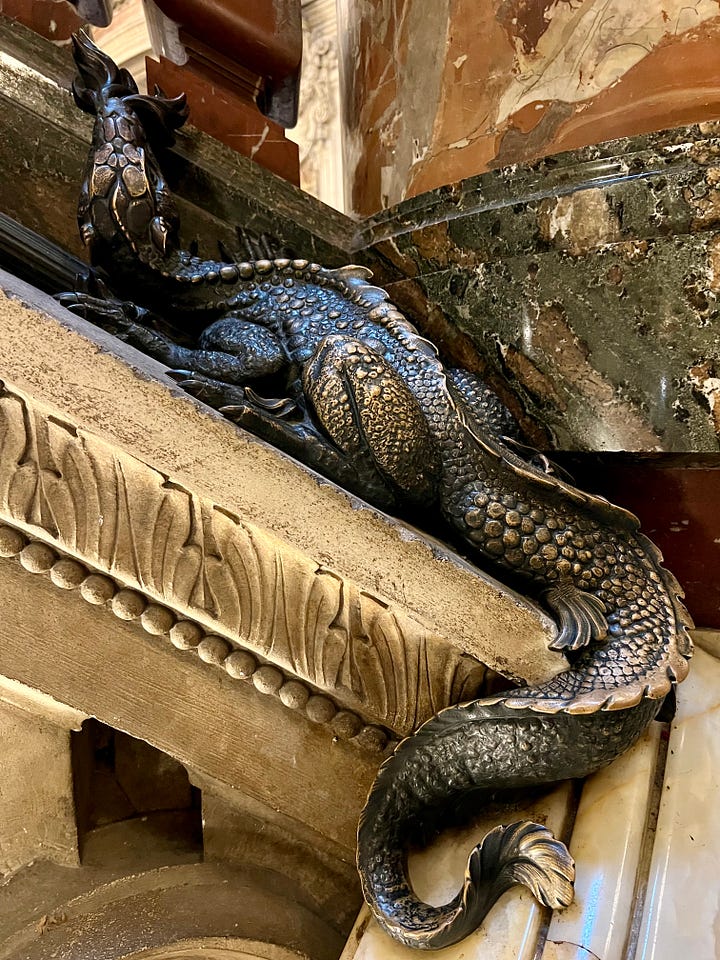 The photos tell you everything you need to know about the Garnier’s over-the-top-yet-perfectly-imagined interiors, but for the architecturally curious among you, Wikipedia describes Napoleon III style as borrowing from Baroque, Palladian, and Renaissance styles. If you doubt the claim that this hybrid style leaves no space undecorated, note the cutie-pie lizard above, tucked into a nook on the staircase.